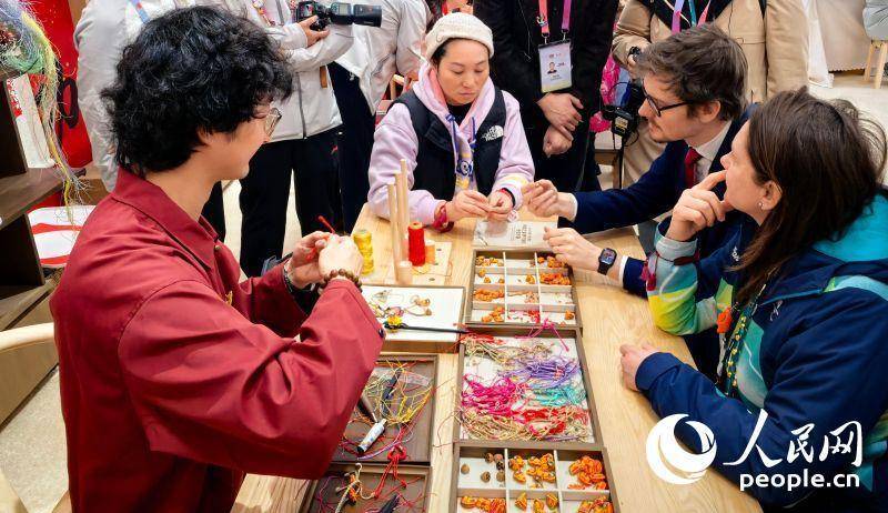 外国游客体验中国传统结绳技艺。