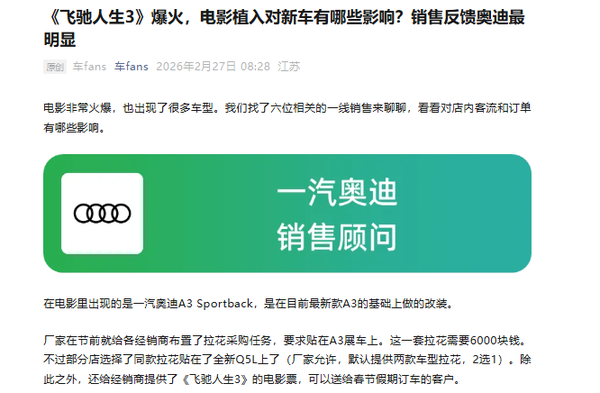 据CNMO了解,电影中出现的车型首先是一汽奥迪A3 Sportback。据销售透露,厂家早在节前就布置了任务,要求经销商花费约6000元采购同款拉花贴在展车上,并提供电影票供赠礼。销售反馈,电影对吸引年轻客流、促进成交有“一定的帮助”,尤其是在对比大众等非豪华品牌时,电影能迅速成为传递品牌形象、建立共同话题的桥梁。销售分析认为,导演韩寒作为奥迪英杰汇成员,其作品的正面影响力对品牌十分有利。