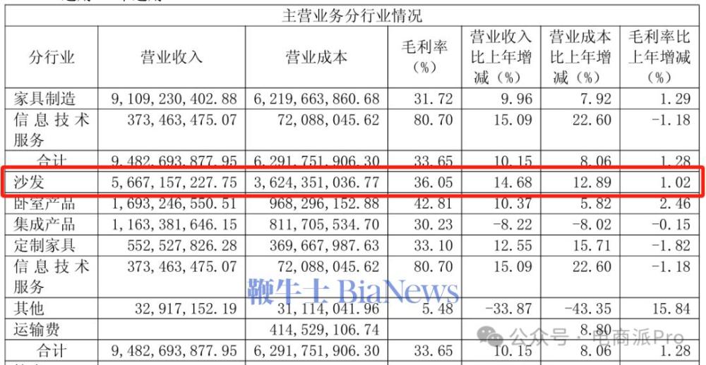 从销售数据来看,沙发类产品是顾家家居绝对的主力产品。2025年上半年,顾家家居沙发类收入为56.67亿元,占所有品类的57.82%;与去年同期的49.42亿元相比,增长7.25亿元,占比也增加2.35个百分点。