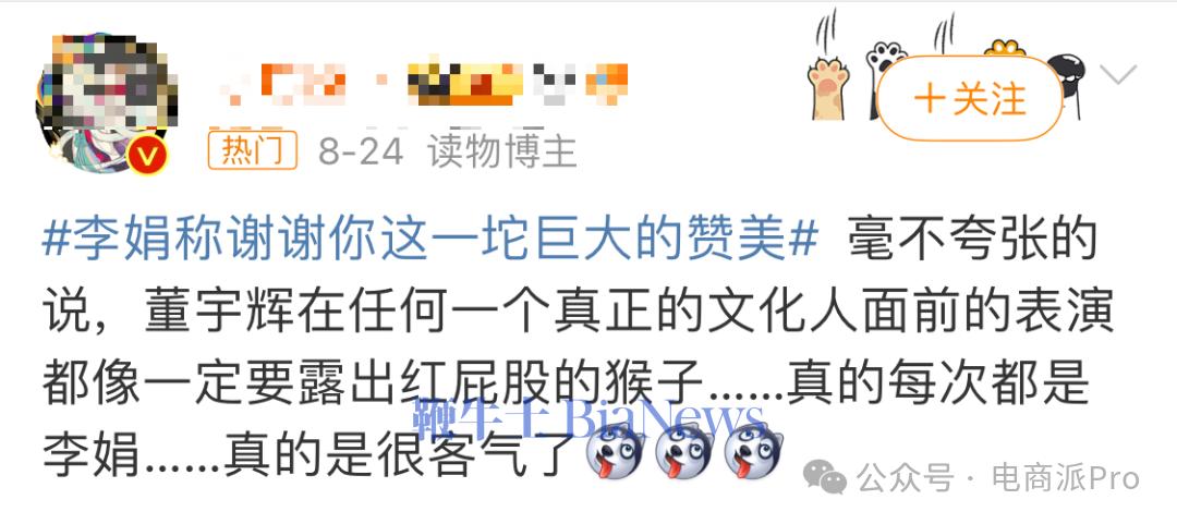 在这场直播中,董宇辉与李娟的对话显得格格不入,他的表现只得到了李娟“谢谢你这一坨巨大的赞美”的回应,被网友批评“爹味太浓”。