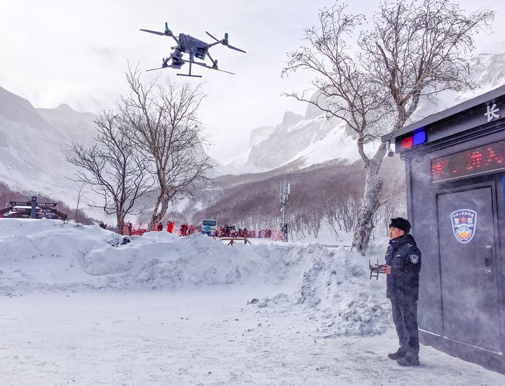 1月21日,在长白山北景区,长白山公安局池北区分局光明森林派出所民警正在使用无人机巡航。新华每日电讯记者 王帆 摄服务之心,传递为民温度